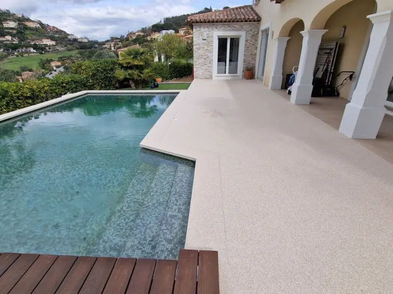 Ensuite, opter pour un revêtement drainant est également crucial pour prévenir les problèmes d’humidité et de stagnation d’eau autour de la piscine. Un revêtement qui permet à l’eau de s’infiltrer à travers la surface assure un drainage efficace, maintenant ainsi la plage de piscine sèche et sûre. La moquette de pierre Home Résine se révèle être une solution idéale en tant que revêtement drainant, assurant une évacuation efficace de l’eau tout en maintenant sa performance antidérapante.