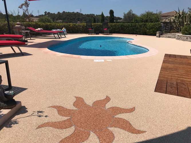 Après des discussions approfondies avec notre équipe, le client a opté pour un coloris rose corail pour la moquette de pierre autour de sa piscine. Cette teinte vibrante et chaleureuse était un choix audacieux mais inspiré, apportant une touche de fraîcheur et de modernité à la plage de piscine. De plus, pour ajouter une touche ludique et personnalisée, le client a décidé d’incorporer un motif en coloris Rouge de Vérone, créant ainsi un contraste saisissant et un point focal unique pour l’espace extérieur.