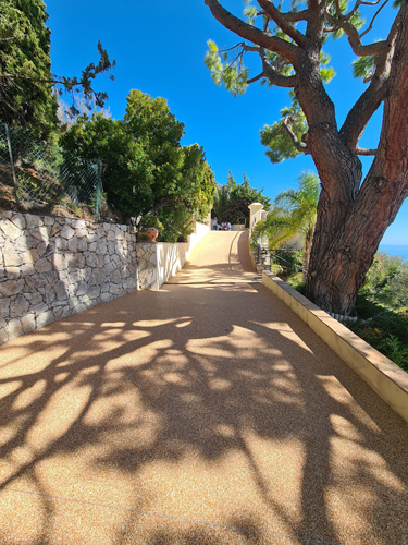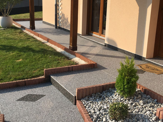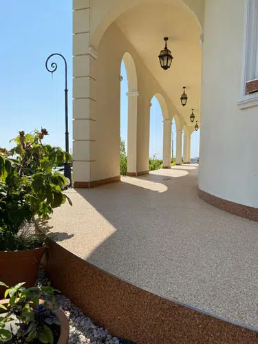 La résine, utilisée pour lier les granulats de marbre, est d’une grande qualité et devient totalement inerte une fois appliquée. Elle est très résistante aux épreuves que peuvent subir des revêtements d’allées extérieures. Il n’est pas nécessaire d’appliquer tout autre produit dessus pour vernir le revêtement ou faire les finitions.